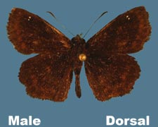 | Commentary/Habitat: Hayhurst’s Scallopwing inhabits open woodlands, woodland borders, and disturbed areas around farmyards. Adults perch moth like, with their wings spread out at their sides. |